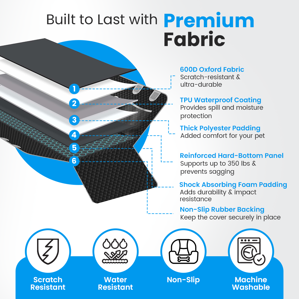 The CozyRider provides complete protection and cleanliness for your seats, side-doors, and interior. Reinforced with premium and extra durable fabric, the CozyRider can hold 2 large Great Danes or 5 medium sized Labs, and will last longer than any product on the market.